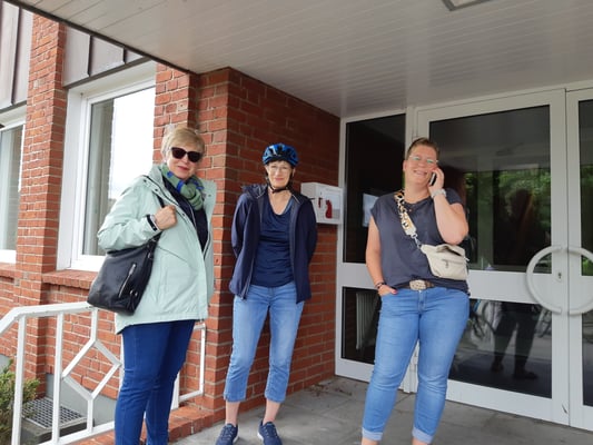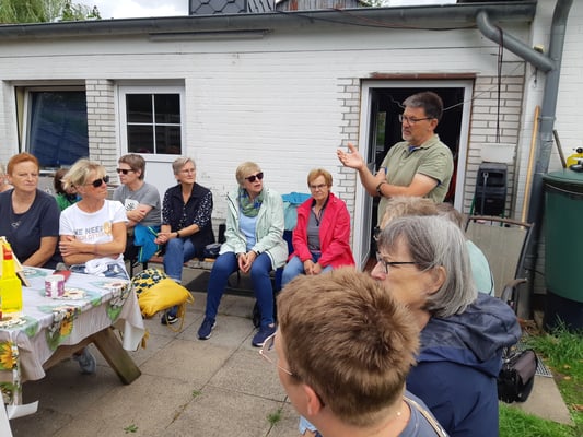 Am Mittwoch, den 12. Juli 2023 machten sich 22 LandFrauen mit dem Fahrrad auf den Weg, um mehr über unsere Vereins-Biene zu erfahren. Kurz vor der Abfahrt kam dann am Nachmittag doch noch die Sonne hinter den Wolken hervor und die Damen starteten mit bester Laune. Auf Feldwegen, eingerahmt von saftig grünen Wiesen und Feldern, fuhr die Truppe ganz gemütlich nach Elsdorf-Westermühlen. Dort wurden sie von den Hobbyimkern Ute Storm und Holger Riemer sehr herzlich im eigenen Garten begrüßt.
