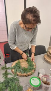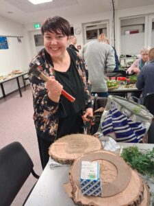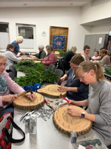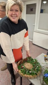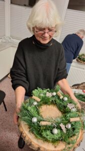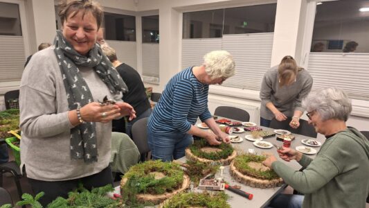 In diesem Jahr stand der „Adventskranz mal anders“ im Mittelpunkt: Auf einer Holzscheibe( gesägt und vorbereitet von Uwe Mehrens-1000 Dank dafür) mit einer Nägel-Umrandung als Grundform versehen, entstanden ganz individuelle, moderne und ausgesprochen kreative Advents-dekorationen. Jede Teilnehmerin gestaltete ihr eigenes kleines Kunstwerk – und die Ergebnisse waren wirklich wunderschön.