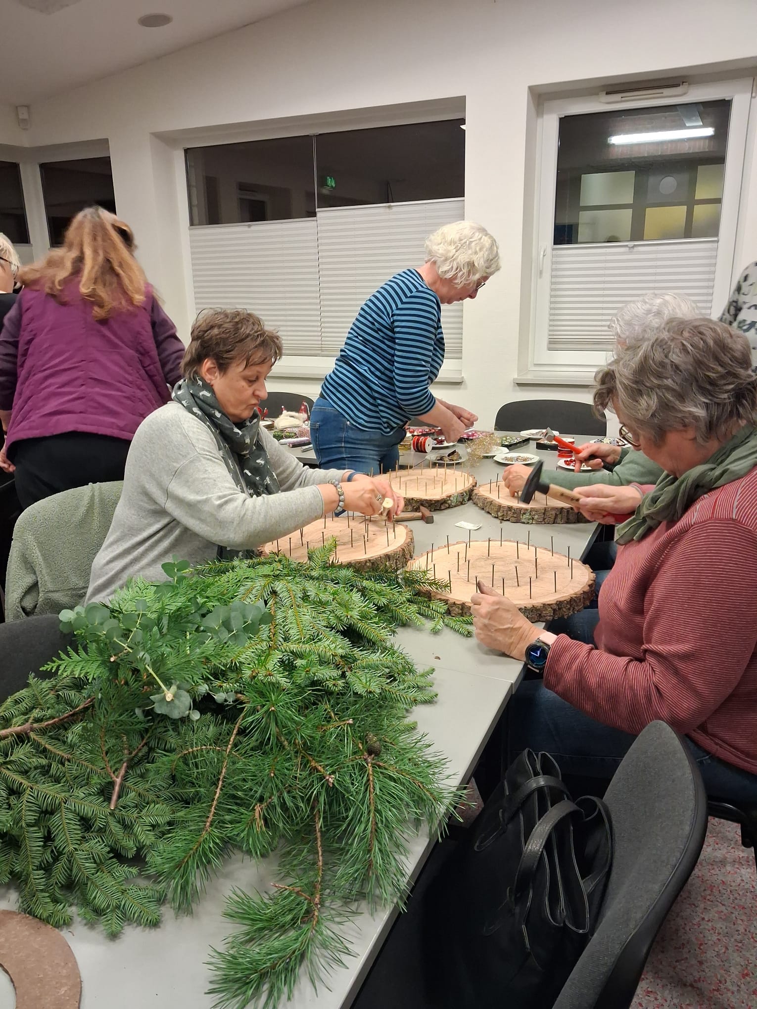 In diesem Jahr stand der „Adventskranz mal anders“ im Mittelpunkt: Auf einer Holzscheibe( gesägt und vorbereitet von Uwe Mehrens-1000 Dank dafür) mit einer Nägel-Umrandung als Grundform versehen, entstanden ganz individuelle, moderne und ausgesprochen kreative Advents-dekorationen. Jede Teilnehmerin gestaltete ihr eigenes kleines Kunstwerk – und die Ergebnisse waren wirklich wunderschön.
